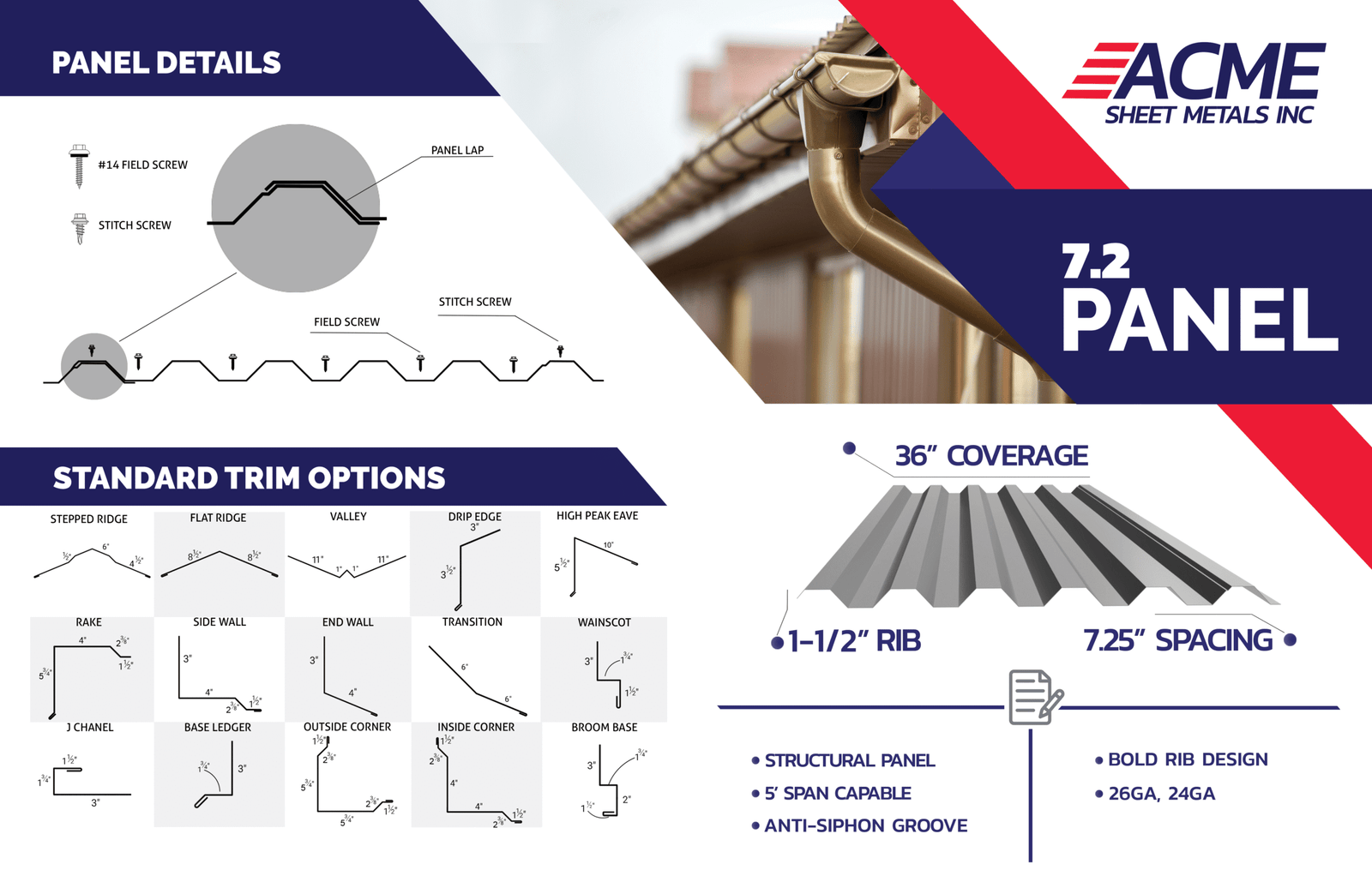 The ACME 7.2 PANEL is a 36″ wide panel with a 1-1/2″ rib every 7.2″ on centers. This panel offers a bold rib and is great for roofing and architecturally appealing siding applications.