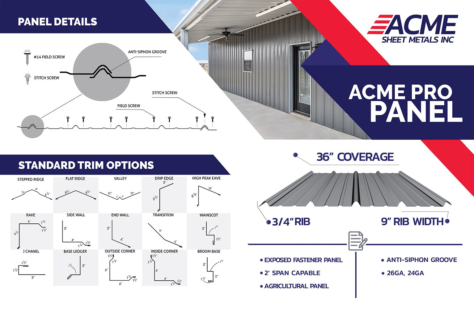 The 3′ ACME PRO PANEL is a 3′ wide panel with 3/4″ ribs every 9″ on centers. This panel features an anti-siphon groove for added protection on roofing applications. This panel has the capability of spanning 2′ on purlin installation applications such as pole barns making it a go-to for agricultural applications