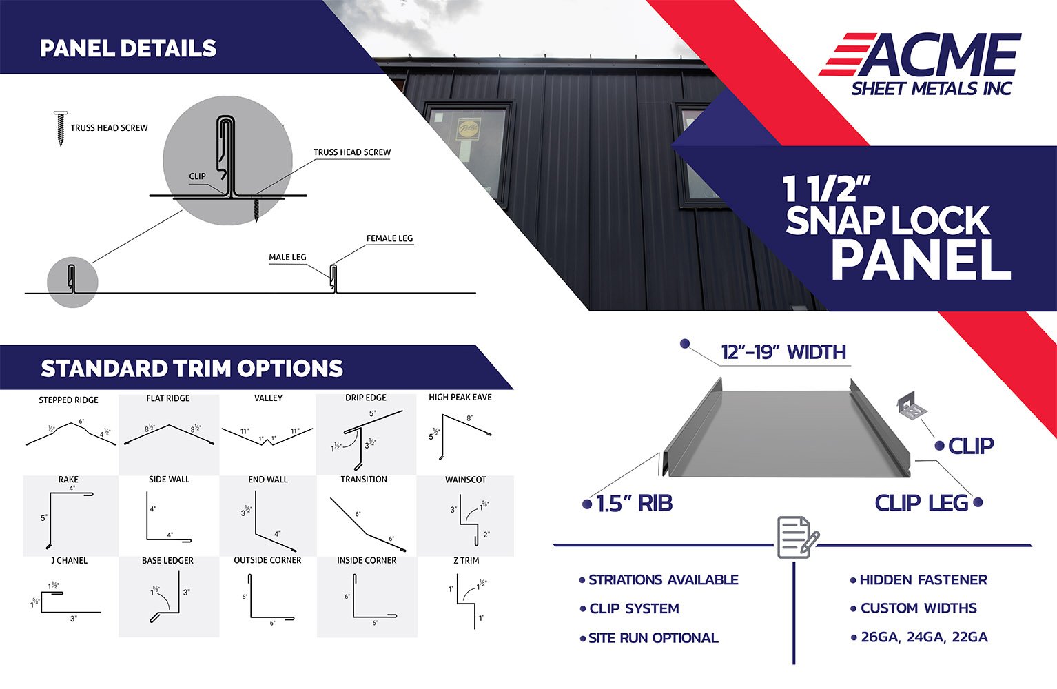 The ACME 1-1/2″ SNAP LOCK Panel features a 1-1/2 standing seam and has a customizable width. This panel requires a clip system and allows for maximum expansion and contraction.